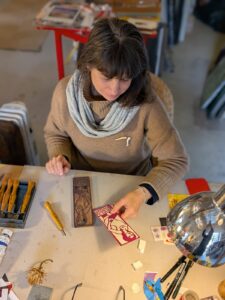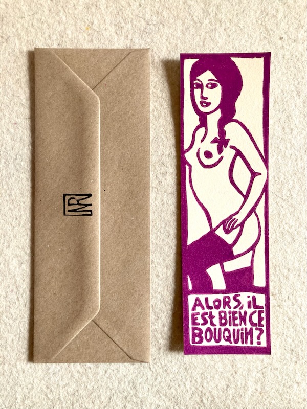 J'ai rencontré Nathalie Rousseau dans son atelier du Luberon et j'ai tout de suite craqué pour son univers mêlant l'intime de sa sensibilité et l'extime poétique (et parfois coquin) de ses œuvres. Et si on collaborait? Naturellement, le signet d'art s'est fait une place dans nos esprits. Une série limitée de 10 marques pages numérotés, dans une couleur réservée à l'Amour des Maux, le pourpre de Tyr (on se la pète, oui, la couleur des impératrices et empereurs). Xylographie, gravée à la main, puis tirages sur carton fin durable. Chaque signet est accompagné d'une enveloppe estampillée de son sceau.